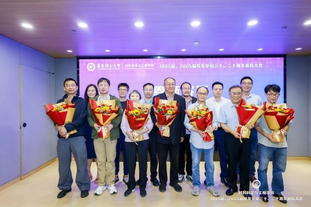 在校友代表发言环节,复材910班,核工业第八研究所总工程师、副所长徐哲军围绕“感悟、感谢、祝福”三个关键词交流,由衷感谢母校的培养,他谈到,华理为行业输送了大量专业人才,结合自身工作实践,就材料学科发展如何顺应时代变革交流了见解。材911班,度亘核芯光电技术(苏州)股份有限公司总裁张艳春回顾了在华理的求学时光,高度认同学校注重学生全面发展的育人理念,结合个人职业成长经历,他指出材料领域创新空间广阔,呼吁广大校友将个人成长与学校学院发展紧密融合。高材014班,上海芳瑜新材料科技有限公司总经理韩晓波,结合屏幕上的两张合影,以“三个心愿”为主线,分享了重返母校的感悟与个人发展历程,他表示将始终铭记投身材料行业的初心,以踏实的心态做好每一件事。无材011班,上海大学教授杨光深情回忆了在华理的学习与科研岁月,他谈到,毕业后与校友合作倍感亲切,彼此间深厚的信任感正是母校所赋予的宝贵财富。