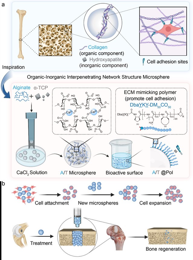 该研究选用α-磷酸三钙(α-TCP)作为无机组分,因其水合反应可在生理pH值条件下进行;且其水解生成的缺钙羟基磷灰石(CDHA)在晶体结构、化学组成和形态特征上与天然骨矿物更为接近。同时选用具有安全无毒的海藻酸钠(Alg)作为有机组分。值得注意的是,α-TCP释放的Ca2+不仅能促进缺损部位的矿化过程,还可作为海藻酸钠凝胶化的可靠钙源,从而确保复合材料的稳定性。该研究通过一步离心法制备了粒径均一可控的Alg/α-TCP复合微球,该微球具有天然骨相似的有机-无机互穿网络结构。为进一步模拟细胞外基质(ECM)蛋白中的细胞粘附位点,该研究采用近期发现具有促进细胞粘附功能的阳离子-两亲性β-氨基酸聚合物DbaYKY-DM50CO50对微球表面进行修饰。体外实验表明,经修饰的Alg/α-TCP复合微球能有效支持细胞粘附、增殖,并实现一体化的细胞冻存、复苏与扩增。在大鼠股骨缺损模型中,该微球展现出优异的骨修复效果。