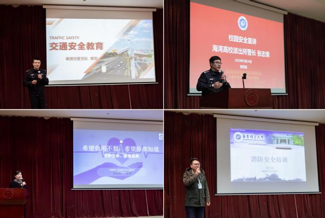 奉贤交管支队二大队指导员曹荣结合高校周边交通环境和典型案例,深入讲解交通法规与风险防范要点,引导同学们养成文明出行的良好习惯。海湾高校派出所警长张志荣聚焦校园安全,从防范电信网络诈骗、防盗防窃等方面剖析常见风险,帮助同学们增强防范意识。校保卫处消防管理科副科长骆海锋系统讲解火灾预防、初期扑救和逃生自救等关键知识,提醒同学们时刻绷紧消防安全这根弦。校医院副院长鹿博通过专业讲解与现场演示,向同学们普及心肺复苏、海姆立克急救法等实用急救技能,强调在“黄金时间”内科学施救的重要性。